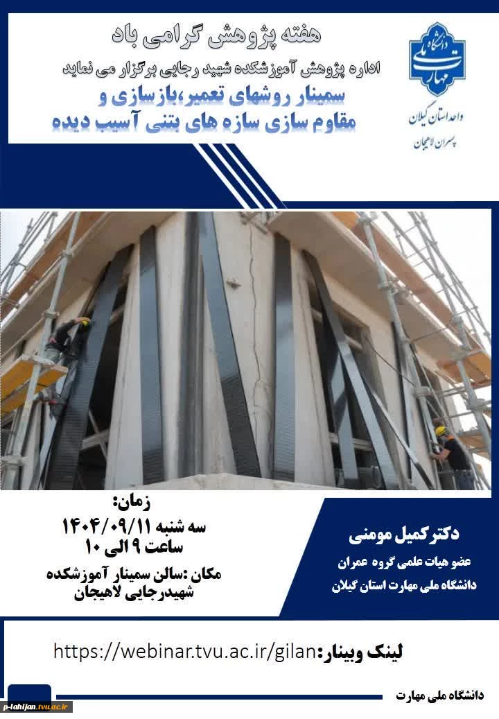 امتیاز دهید : سمینار روشهای تعمیر ، بازسازی و مقاوم سازی سازه های بتنی آسیب دیده - آموزشکده ملی مهارت شهید رجایی لاهیجان 4 چهارشنبه 12 آذر 1404 ساعت 11:19